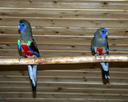 Hier sieht man ein junges Pärchen Rotsteißsittiche oder auch Blutbauchsittich genannt. |